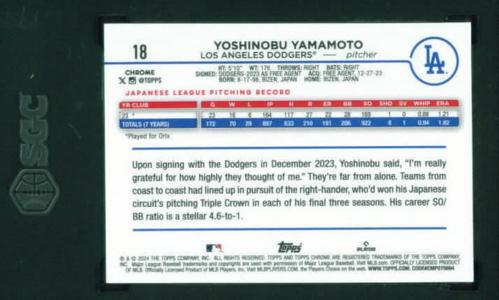 Topps Chrome #18 YOSHINOBU YAMAMOTO rc Dodgers SGC-9.5 $15.00